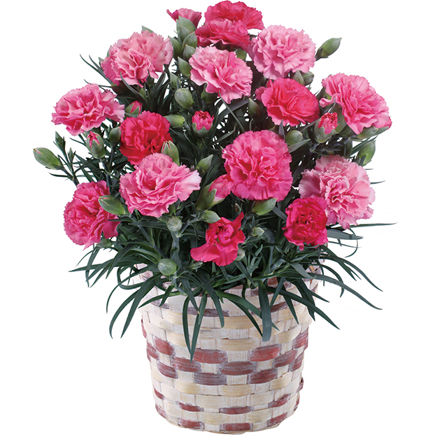 グラデーションが楽しめる 咲き始めの濃いピンクから淡いピンクへと移ろう愛らしいカーネーション。グラデーションがお楽しみいただけます。※カゴのデザインが変更になる場合がございます