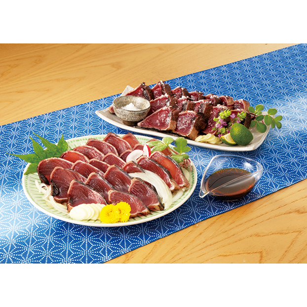 一本釣りで漁獲した戻り鰹を土佐伝統の藁焼きでたたきに仕上げました。ゆず風味のたれと特産の天日塩付で食べ比べできます。明神水産 藁焼き鰹たたきセット(塩・タレ付)
