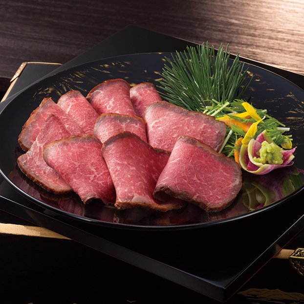焙煎黒胡椒をまぶしたローストビーフを「肉たれ」と「ごまポン酢」で楽しみください。笠原将弘監修 賛否両論 和のローストビーフ