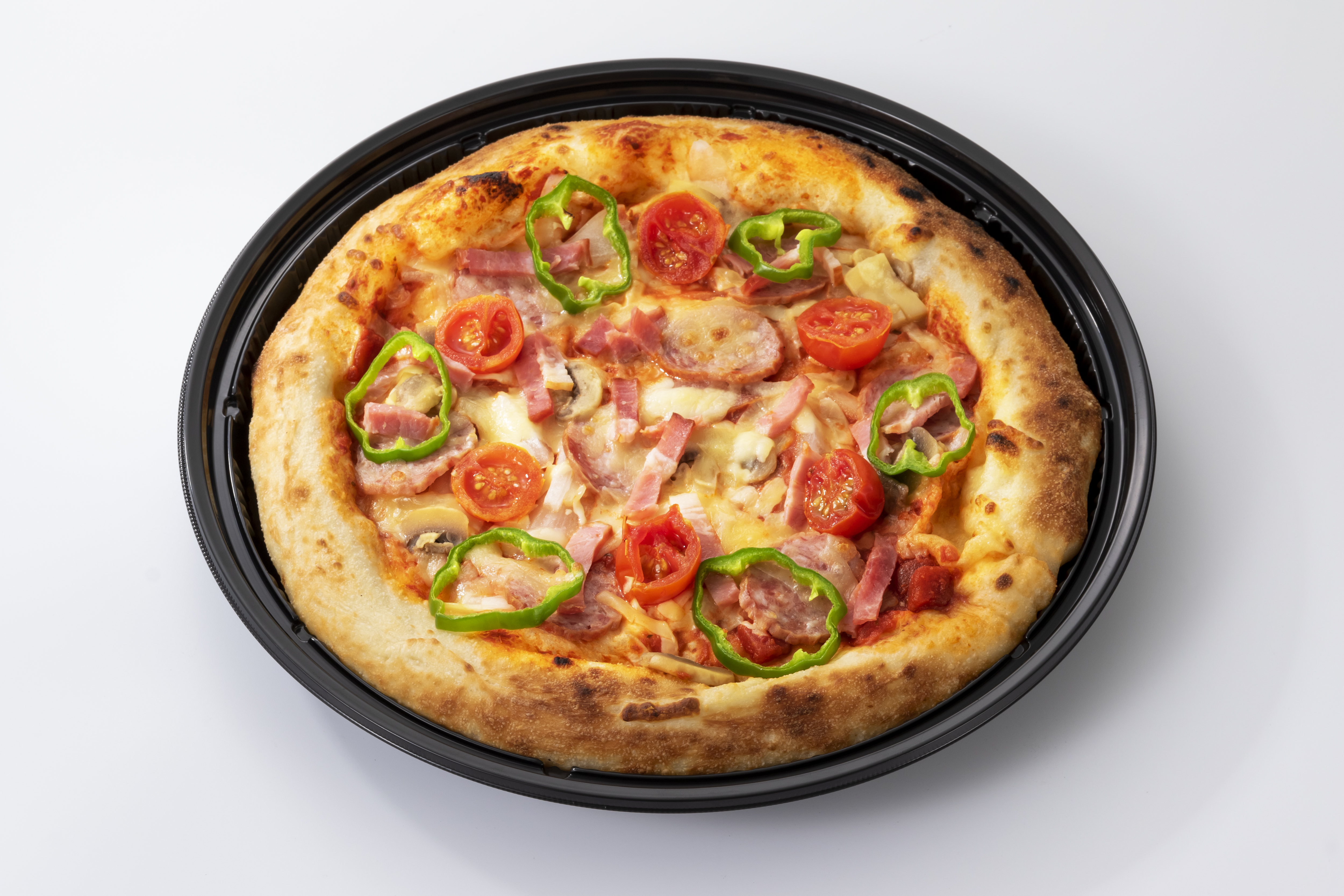 トマトソースをベースに、サラミ、ベーコン、マッシュルーム、ピーマン、玉ねぎ、プチトマトをトッピングした人気のピザです。 直径約25センチのハーフカット、3ピースとなります。 ※写真はホールサイズの商品です。