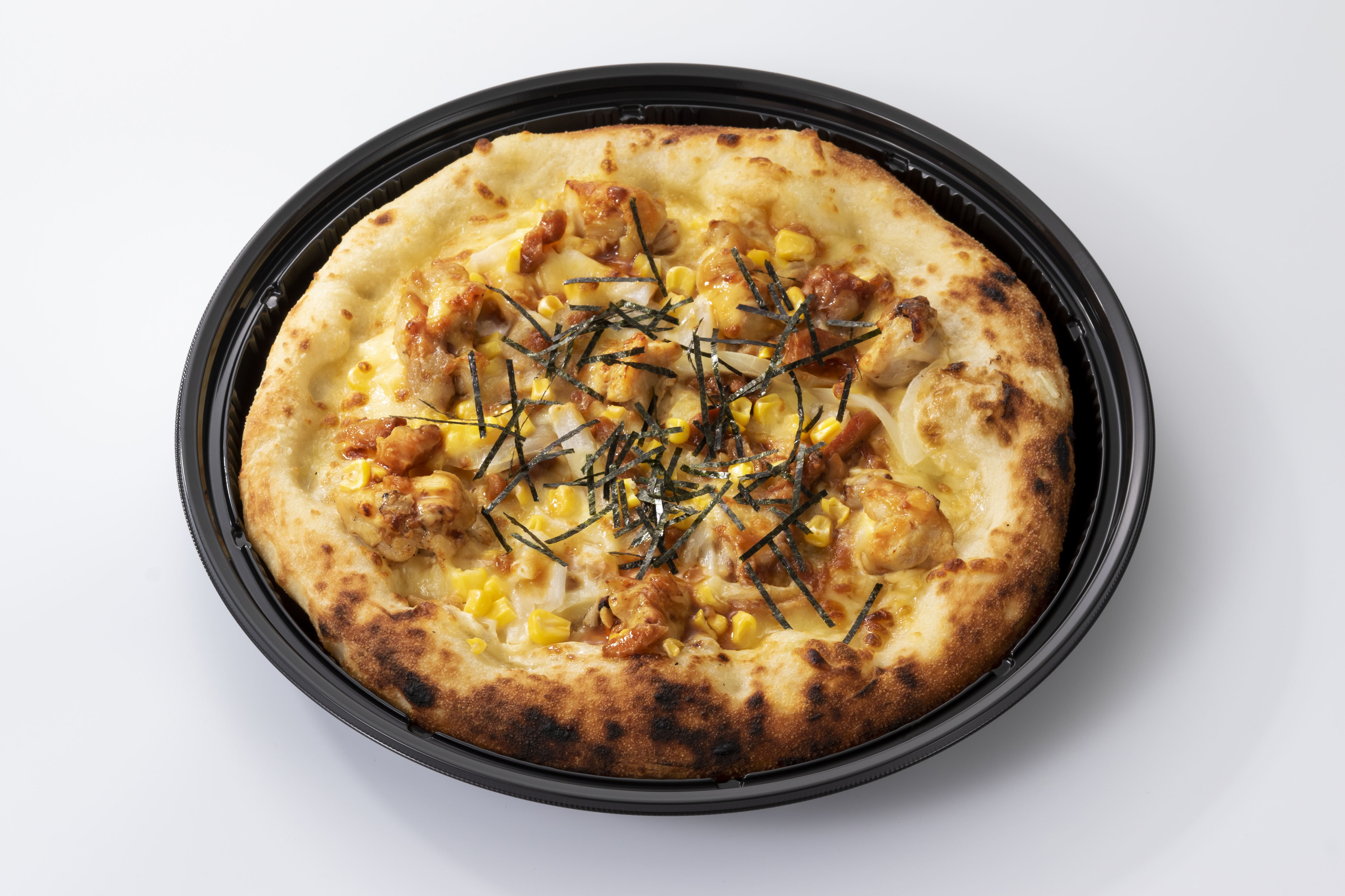 マヨネーズをベースに甘辛だれにからめた炭火焼チキンがゴロゴロ! 仕上げに刻みのりをトッピングしました。 直径約25センチ、6ピースとなります。